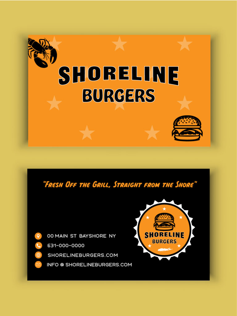 • Business card design with the Shoreline Burgers wordmark, tagline, and contact details.