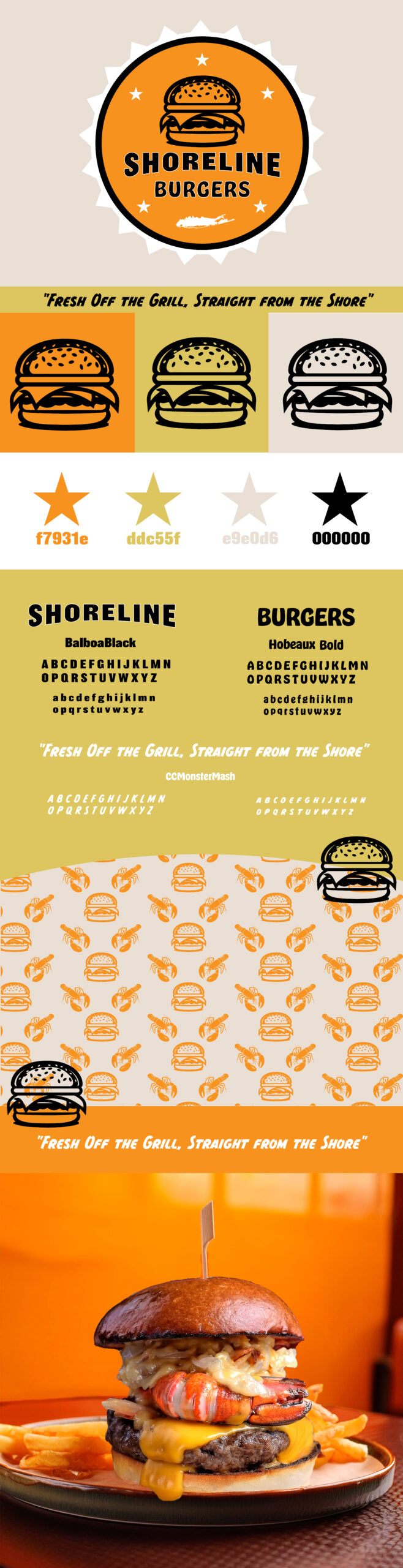 From this exploration, I locked in the name “Shoreline Burgers” and the tagline “Fresh Off the Grill, Straight from the Shore” as the foundation of the concept.