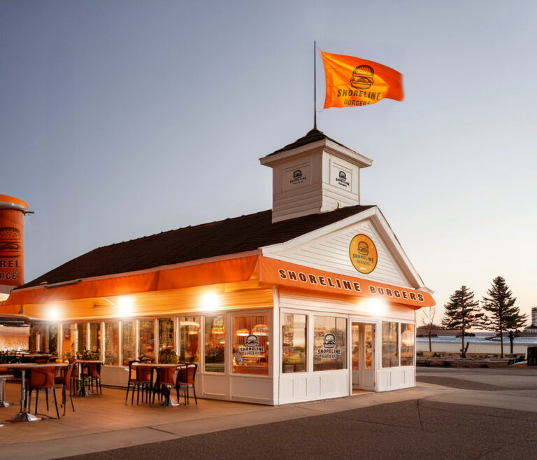 • Exterior restaurant mockup with Shoreline Burgers signage, awning, and flag in the brand colors to show how the concept would look in a real setting.